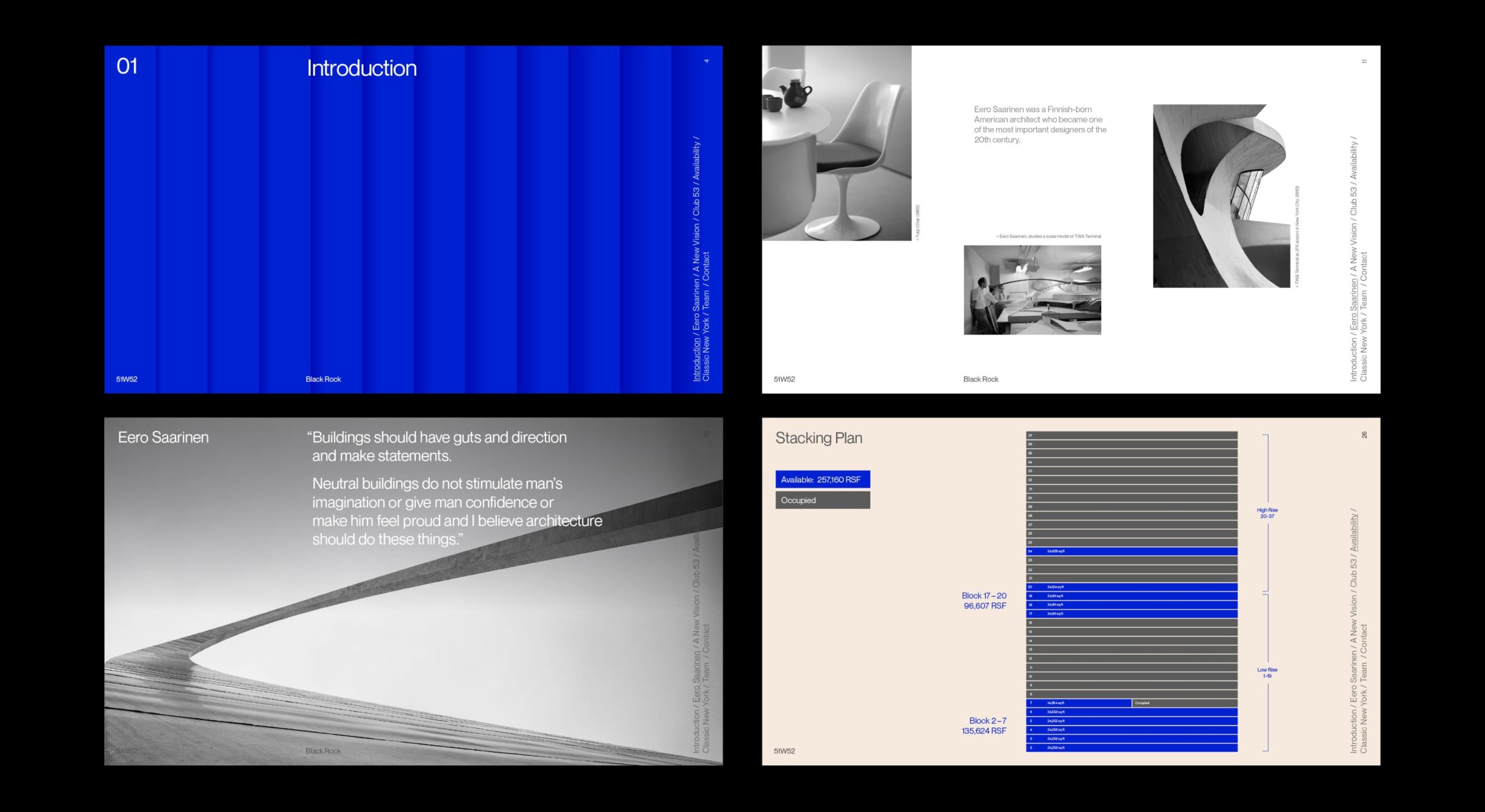 We picked up on Saarinen’s intent for the building with a modern take on neo-futurism and Bauhaus fonts, which led to a monospaced logo celebrating the minimal style and column-free floor plates. A graphic language was created to reflect the shadow moving along the unique exterior, monolithic granite triangle columns which also reflected Saarinen’s intent of wanting the viewer to look up at the building. A bold International Klein Blue was added to reflect the aesthetic of neo-futurism and contemporary design.
